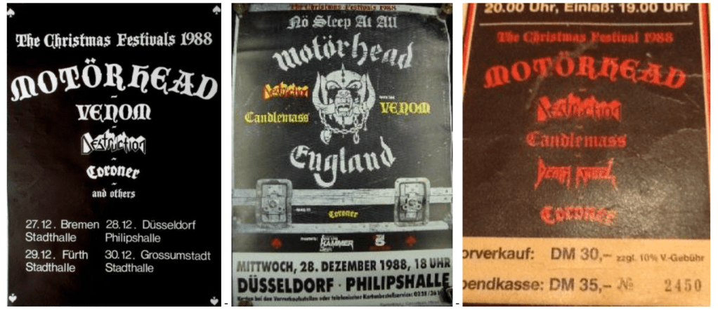 What we talked about mostly was the 1988 Christmas shows in Germany, where Coroner, Sacred Reich, Candlemas, and Destruction opened for Motörhead. It was their first European show, and the first night they played, the British contingent was an hour and a half late, causing the show to be equally late, so to avoid Motörhead having to go on in the wee hours, the played before Sacred Reich played last — following Motörhead, which no band wants to do. It was, in a word, harrowing. That said, they were given the penultimate slot before Motörhead the next night to make up for the previous night.