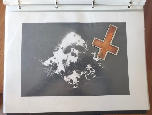 So…here’s a print of the original manipulated photo used for the cover of the Death Cult demo, and that is the actual sheet metal/copper cross that Marky placed upside-down on the skull’s forehead. And right after I took this picture, as picked it up to place back into its box, I dropped it, and the sheet metal and copper parts separated.